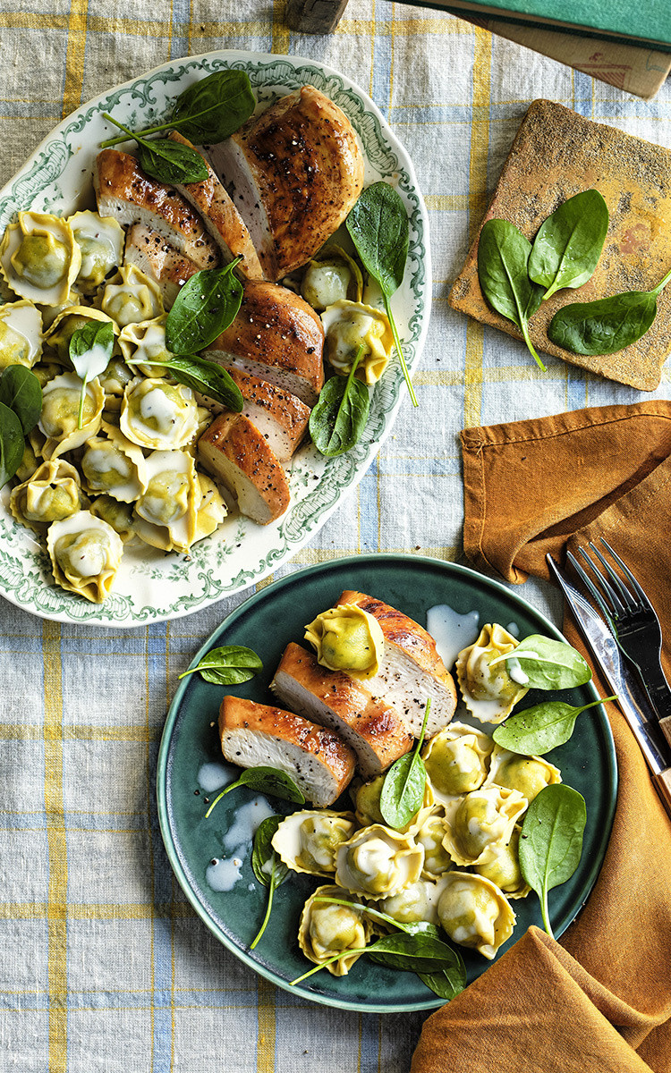 Écrasez la gousse d'ail et ajoutez-la au lait avec le romarin, quelques grains de poivre écrasés et un filet d'huile. Versez le lait sur le blanc de poulet dans un bol, de manière à le couvrir, et laissez mariner pendant 30 minutes. Égouttez le poulet et faites-le cuire dans une poêle avec un peu d'huile, dans un récipient couvert, pendant environ 20 minutes, en le retournant de temps en temps. Salez le poulet, ajoutez un morceau de beurre et augmentez légèrement la chaleur pour bien dorer la viande. Enveloppez-la dans du papier aluminium et réservez. Faites cuire les tortellacci dans une grande quantité d'eau salée, puis égouttez-les et transférez-les dans la poêle dans laquelle vous avez cuit le poulet. Assaisonnez-les avec la crème en les mélangeant délicatement. Transférez dans les assiettes, ajoutez le poulet, les feuilles d'épinards et un filet d'huile. Poivrez à votre goût et servez.