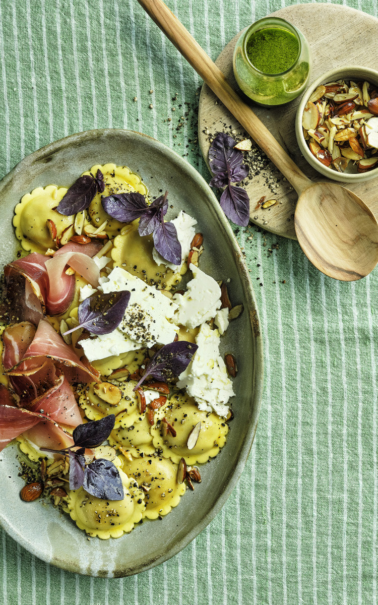 Spoel de basilicumblaadjes af, dompel ze enkele seconden in kokend gezouten water, laat ze uitlekken, koel ze af in ijskoud water, knijp ze uit en pureer ze met 100 ml extra vierge olijfolie. Snijd de amandelen in reepjes en rooster ze in een pan met een eetlepel olie. Kook ondertussen de ravioli in gezouten kokend water volgens de aangegeven kooktijd. Giet ze af, voeg ze toe aan een serveerschotel en breng ze op smaak met de amandelen. Garneer met plakken spek, de verkruimelde feta en de rode basilicum. Breng op smaak met basilicumolie en een beetje peper en serveer.