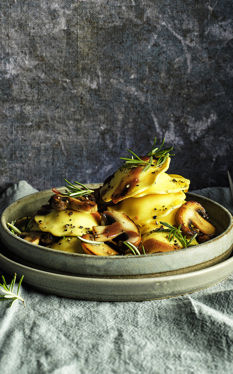 RAVIOLI ZALM EN MASCARPONE MET CRÈME VAN KNOFLOOK EN VERSE SPINAZIE